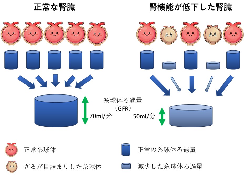 その結果、腎臓全体としての「ろ過量」、すなわちGFRが減ってしまうのです。