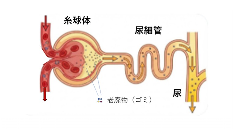 どうやって出しているかというと、まず腎臓に入ってきた血液中の老廃物(ゴミ)を「糸球体」でろ過します。