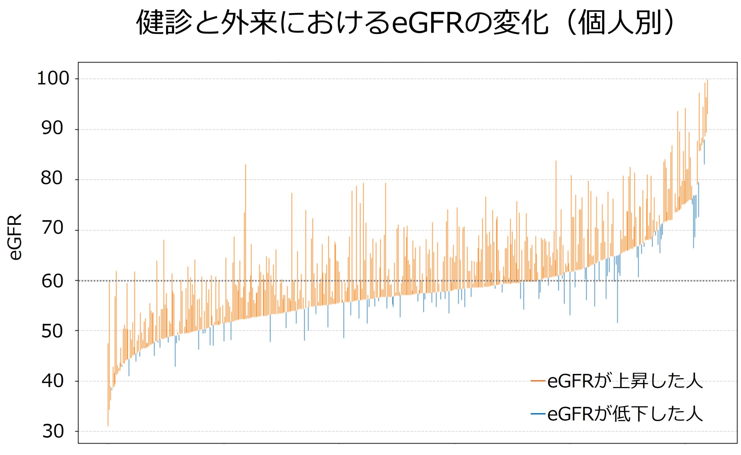 ▪オレンジの線:外来でのeGFRが、健診よりも上昇したことを示しています(線の長さ=上昇量)。