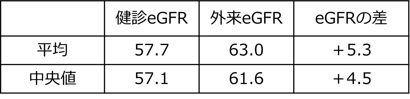 外来でのeGFRは健診に比べて、平均値で「+5.3」も上昇していました。