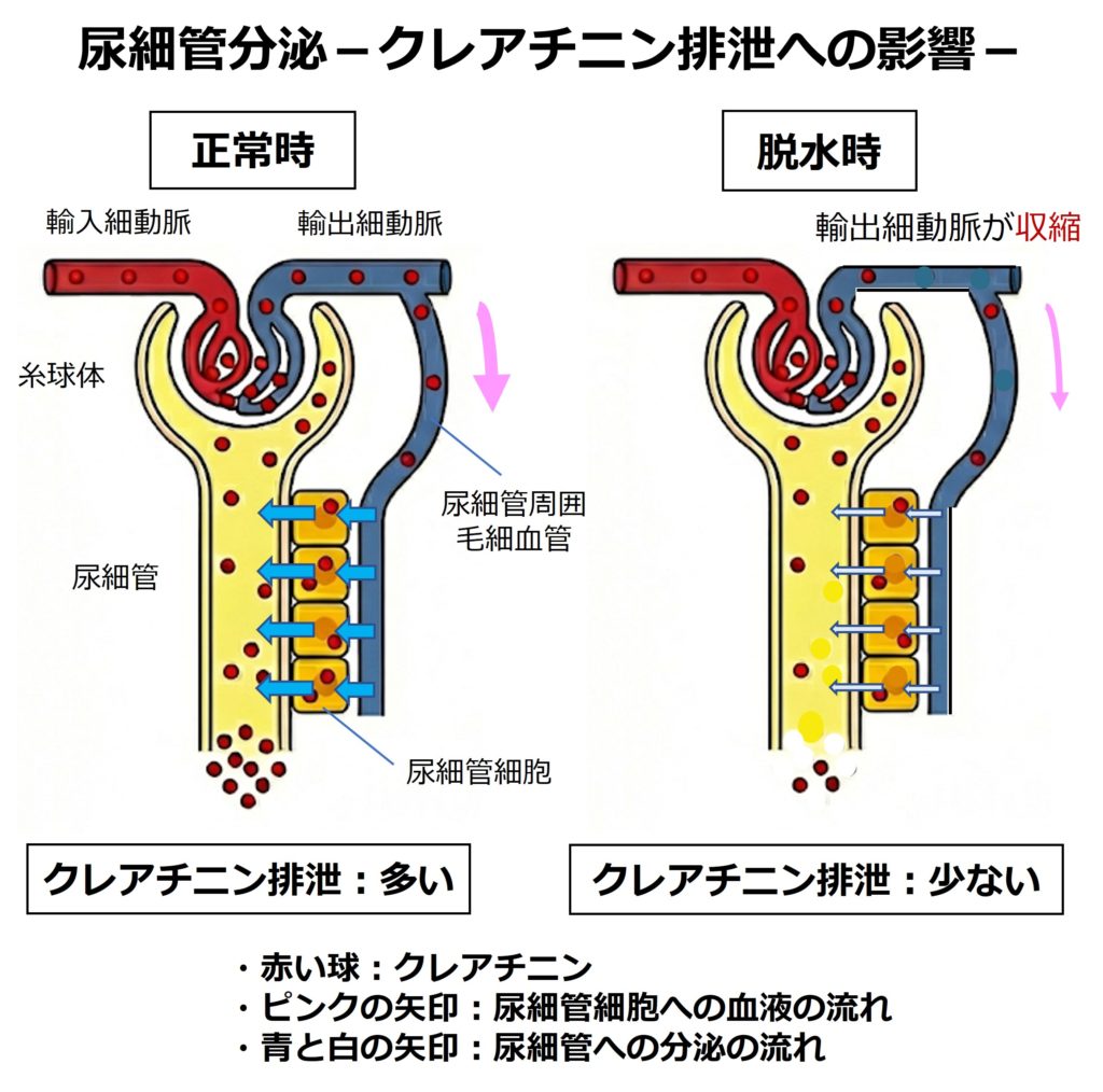 しかし、脱水になると、体の中では次のような変化が起こり、クレアチニン排泄が少なくなります(右図)。