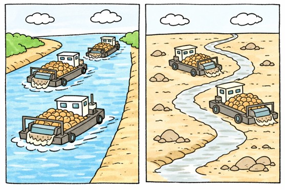 「川の水が少なくなり、ゴミを運ぶ”船(運び屋)“が動かなくなってしまう」イメージです。