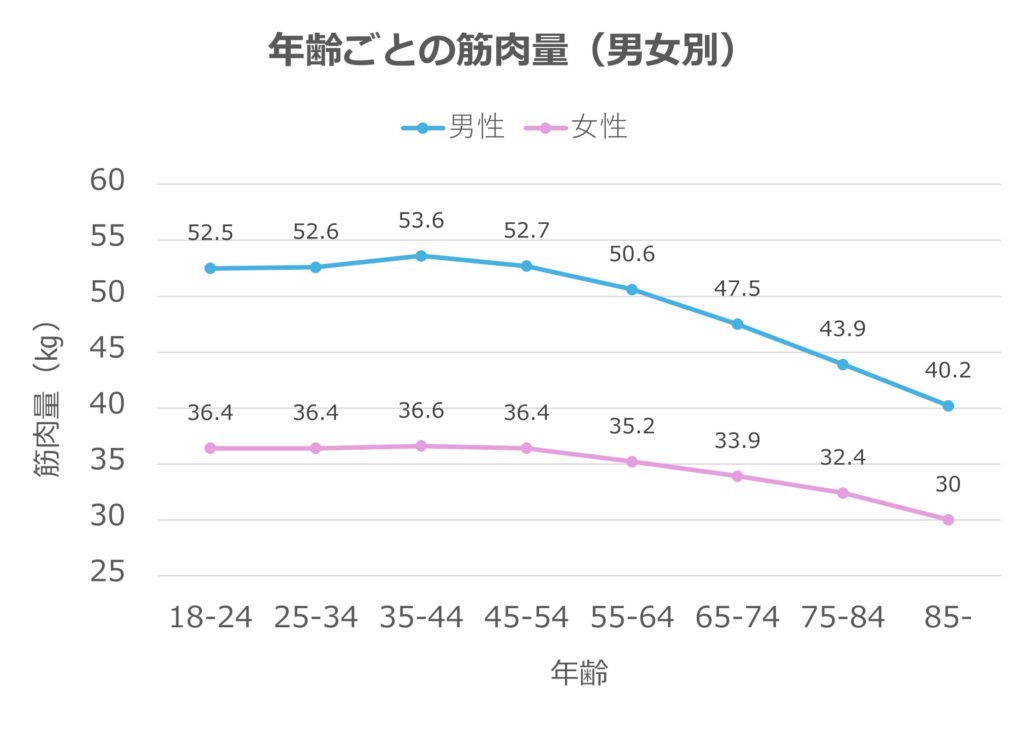 以下に、年齢ごとの筋肉量の変化を示します。