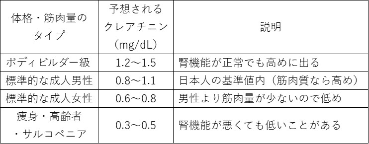 クレアチニンは筋肉から作られる老廃物なので、一般に筋肉量が多い方は高め、筋肉が少ない方は低めになりやすい傾向があります。