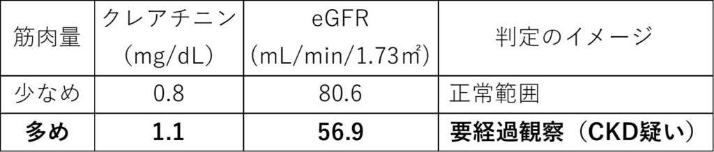 この表を見ると、筋肉量が多い方では、腎臓そのものに異常はなくてもeGFRが「60」を切ってしまい、腎機能低下と判定されることがわかります。